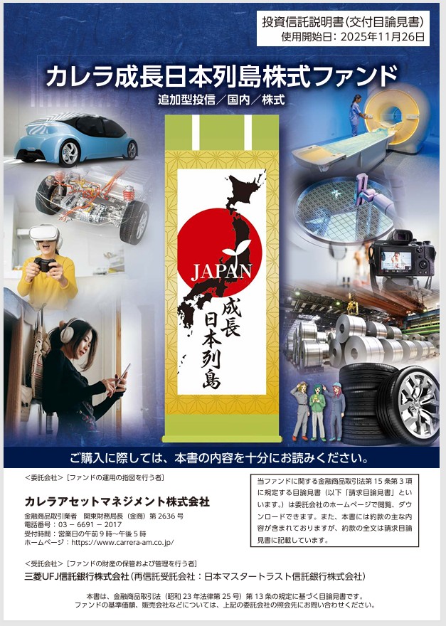 当ファンドは、主として日本の金融商品取引所に上場(これに準ずるものを含みます。)している企業の株式等に投資し、信託財産の中長期的な成長を目指して積極的な運用を行います。こちらはカレラ成長日本列島株式ファンド 分配金再投資コース(コード:123.47)となります。